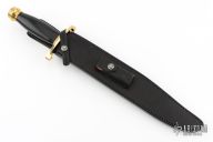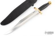 The 13" Randall Thorp Bowie by Randall Made Knives is similar to types used by Confederate troops. This one has a 13" carbon steel blade with sharpened top edge, .213" blade stock and 1.558" blade depth, hidden tang construction. The handle has a lugged brass guard, brass butt cap, and a black linen micarta grip with black spacers. Comes with original black leather sheath and a zippered case. Excellent condition.