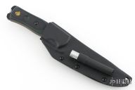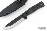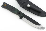This Fieldcraft Fixed Blade was designed by Brothers of Bushcraft for TOPS knives. It features a two-tone blade with satin grinds with a notched thumbrest. The handle is comprised of green/black G-10 over red liners and full tang construction. The handle features a bow drill divot on both scales and the exposed tang pommel features a divot ground into the tang to allow the scraping of a fire steel without having to leave the blade edge exposed. Includes a kydex sheath. Excellent condition.