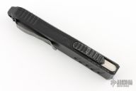 Add a state of the art OTF automatic to your rotation with the RECON-040 from Guardian Tactical. This RECON model is built with a dark stonewashed blade and a black anodized handle and hardware. Guardian Tactical's patented OTF mechanism provides smooth, responsive opening action. The unique thumb slide design is separated from the aluminum handle by a steel plate and 3 ceramic balls that eliminate grinding and wear. An innovative locking mechanism sits off to the side of the blade channel so it doesn't drag against the blade when opening and closing. These features eliminate the friction on the blade and button that have always plagued OTF knives. Take your OTF game to the next level with the Guardian Tactical RECON-040. Features: Anodized aluminum handle is compact and lightweight for durable everyday carry. Innovative OTF mechanism offers fast and smooth opening action for responsive tactical deployment. Item includes a stainless steel pocket clip for secure tip-down carry. Comes with original box. #1201. Has scuffs on the handle, blade, and clip. Great condition otherwise.