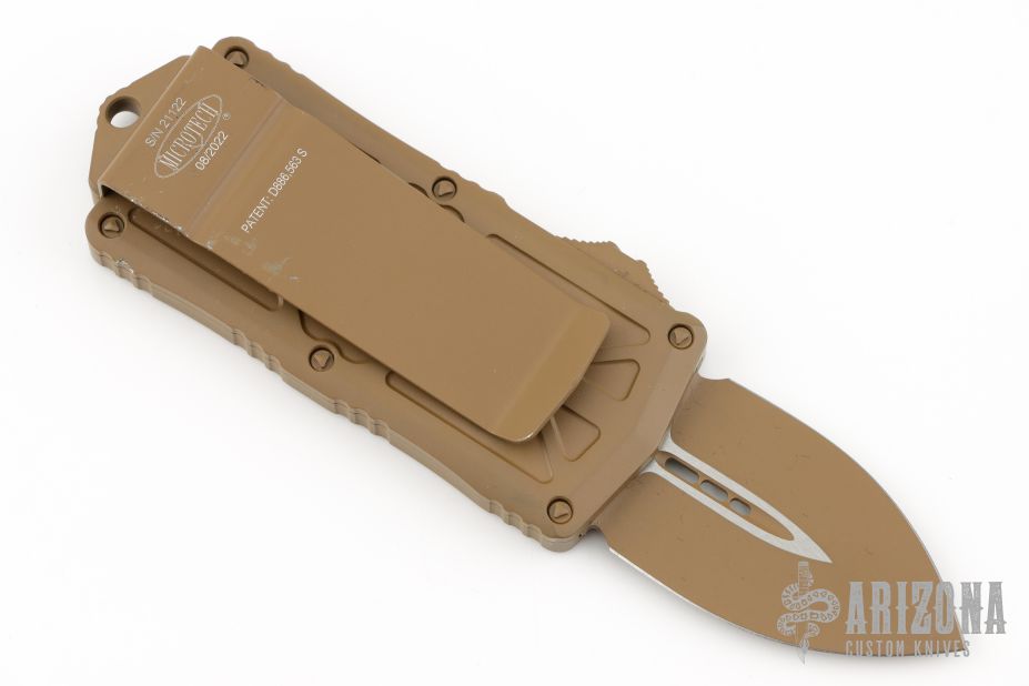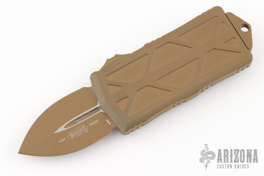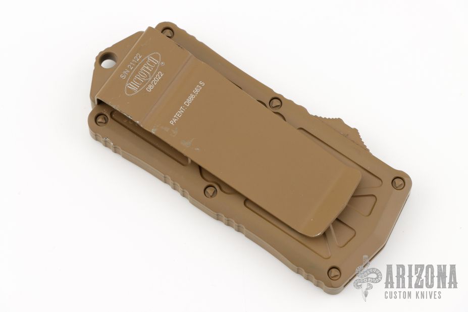 This Microtech Exocet features a tan cerakote finished double-edged blade. The handle has a tan cerakoted aluminum handles and a stainless clip that doubles as a money clip dated 08/2022. S/N 21122. Comes with original box and papers. Has some scuffs and scratches, great condition otherwise.