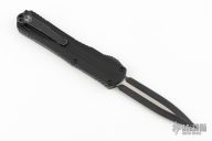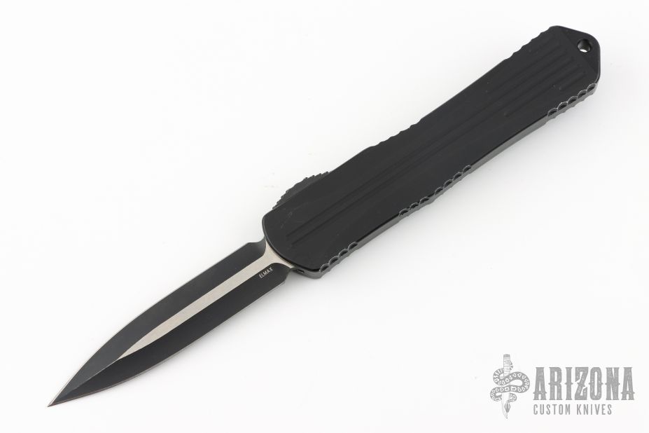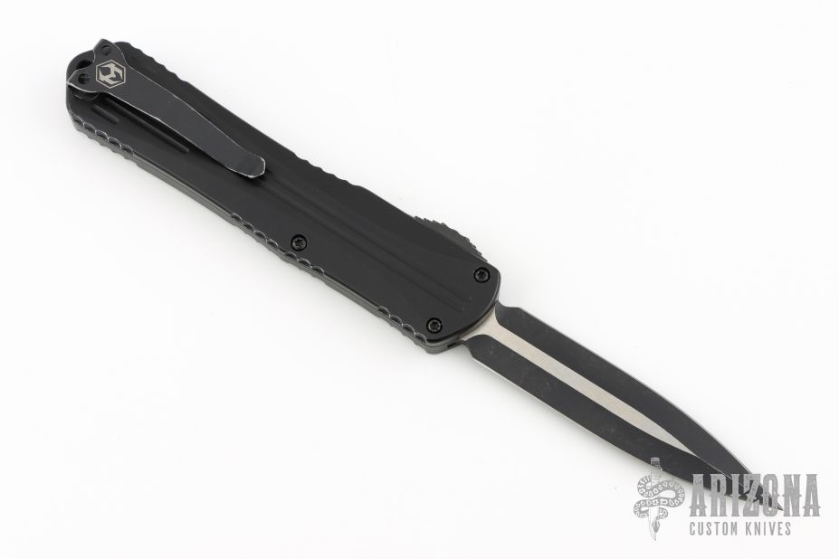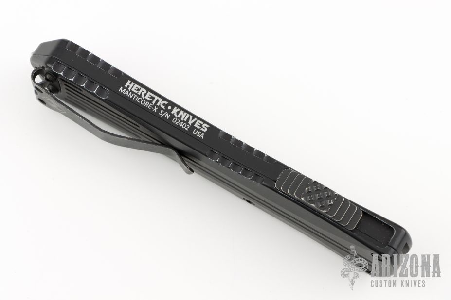 This Manticore-X by Heretic Knives features a battleworn black finished double-edged blade. The handle has a black battleworn aluminum frame with black stainless steel hardware and tip down clip. Comes with original box and papers. #02402. Has some scuffs and scratches, excellent condition.