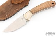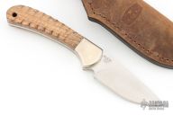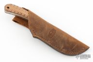 This Ranger Skinner by Buck features a satin finished blade with .118" blade stock and 1.112" blade depth, full tang construction. The handle has nickel silver bolsters, scalloped Honduran Rosewood scales from Taylor Guitars. Comes with original box, papers and distressed brown leather sheath. Excellent condition. 2022 Buck of the Month knife from August.