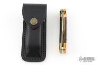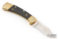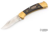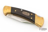 50th Anniversary Edition Buck model 112 Ranger. Has a satin finished blade with nail nick. The handle has a brass frame with genuine ebony wood scales, stainless steel backspacer. Comes with original box, papers and black leather sheath. Excellent condition.