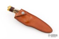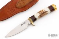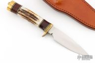 This Model 26 Pathfinder by Randall Made Knives is one of Randall's best-selling models. It features a drop point satin finished blade with .162" blade stock and .979" blade depth, hidden tang construction. The handle has a brass guard and butt, stag grip and black/brass/leather spacers. Comes with a brown leather sheath. Excellent condition.
