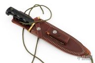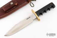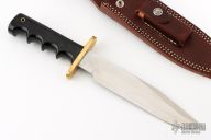 This Model 14 by Randall Made Knives features a satin finished blade with sharpened top edge, .222" blade stock. 1.438" blade depth, full tang construction. The handle has a brass guard, black linen micarta handle with a lanyard hole at the butt. This knife was designed to meet the demand for an almost indestructible all-purpose knife, though it is especially suited for combat and survival purposes. Comes with a brown leather sheath. Has some light scratches and a little oxidation on the ricasso, otherwise excellent condition.