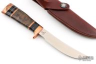 Handle: The blade is construction in a classic, stacked style with figured Walnut at the center and Buffalo Horn toward either end with raw copper fittings and spacers. Expanding toward the pommel, the neutral handle design offers a secure and comfortable grip that is well-balanced thanks to the heavy copper pommel end. A generous finger guard keeps the fingers safe from the blade.