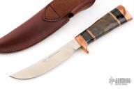 Blade: A trailing point Skinner, this blade is a timeless companion for hunters young and old. The high height hollow grind offers exceptional slicing performance with a fine tip for detail work. A large, unsharpened ricasso allows for a close grip for added control.