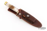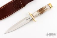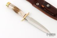 This Model 2-6 Fighting Stiletto from Randall Made Knives has a double edged blade with .203" blade stock and 1.113" blade depth, hidden tang construction. The handle has a brass guard, stag grip, black/duralumin spacers and brass butt. Comes with a leather sheath. Excellent condition.