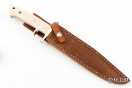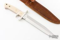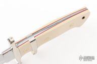 This Sub Hilt Fighter from Steve Voorhis features a mirror polished clip point blade with sharpened top edge, .215" blade stock and 1.200" blade depth, full tapered tang construction. The handle is comprised of a nickel silver guard and sub hilt, ivory paper micarta scales over red liners. Comes with brown leather sheath. Has a couple light scratches and very small spots on the blade, otherwise excellent condition.