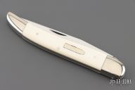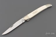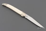 This knife from AG Russel features a mirror polished blade with nail nick. The handle has nickel silver bolsters, front and rear, ivory paper micarta inlays, and stainless steel liners. Excellent condition.