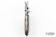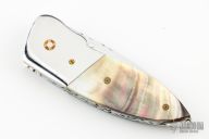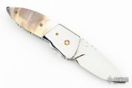 This knife by TS Knife features a mirror polished blade with a single mosaic thumbstud. The handle has mirror polished stainless steel bolsters, black lip pearl scales, mosaic pins, fileworked stainless steel liners and backspacer. Nice blade seating. Has a few light scratches and some minor blade play, otherwise good condition.