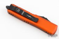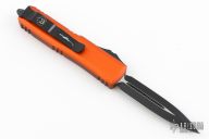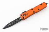 This UTX-85 by Microtech Knives features a black double-edged blade with satin flats and fullers. The handle has an orange aluminum frame with black stainless steel hardware and tip down clip. Dated 10/2023. Comes with original box and papers. Excellent Condition.