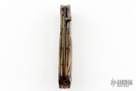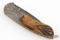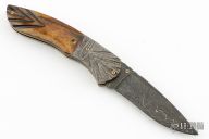 This knife by KJ Custom Knives (Suchat Jangtanong's Son) features a Damascus blade with a single thumbstud with camel bole inlay, fileworked spine. The handle has fluted Damascus bolsters, fluted dyed camel bone scales, anodized titanium liners and fileworked backspacer. Nice detent, lockup and blade seating. Excellent condition.