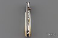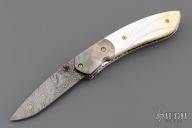 This knife by TS Knife features a Damascus blade with a single brass thumbstud with red stone inlay. The handle has black lip pearl bolsters, carved gold lip pearl scales, gold plated screws, fileworked stainless steel liners and backspacer with black lip pearl inlays. Nice detent, blade seating and lockup. Excellent condition.
