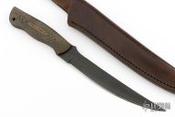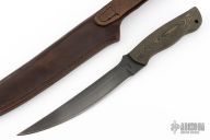 This Fillet Knife from Ricky Fowler has a black finished with .125" blade stock and 1.187" blade depth, full tang construction. The handle has layered green canvas micarta scales. Comes with a leather sheath. Has some scratches, otherwise good condition. #1498