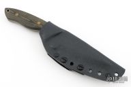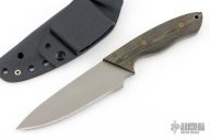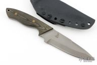 This Hammer by Greg Lightfoot features a chisel ground drop point blade with a fine bead blast finish, notched thumb rest, swedge, .158" bladestock, and 1.42" blade depth. The handle features black/green micarta covers with a lanyard hole in the pommel. Comes with kydex sheath with belt clip. Has a couple light scuffs, excellent condition otherwise.