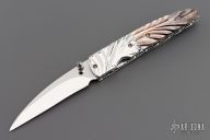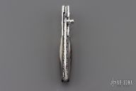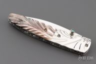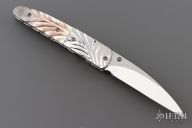 This linerlock by Appaloosa Knives features a mirror polished blade with a single thumbstud with abalone inlay. The handle has polished and carved stainless steel bolsters, black lip pearl inlays, fileworked stainless steel liners and backspacer with abalone inlays. Comes with a leather magnetic case. Has a couple light scratches, otherwise excellent condition.