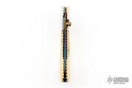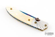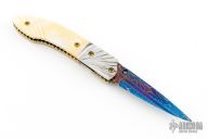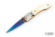This linerlock by Appaloosa Knives features a blued Damascus blade with a single brass thumbstud with red stone inlay. The handle has polished and carved stainless steel bolsters, carved gold lip pearl inlays, fileworked and anodized liners and backspacer. Nice detent, blade seating and lockup. Comes with a leather magnetic case. Has light oxidation spot on the bolster, otherwise good condition.
