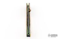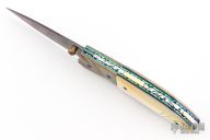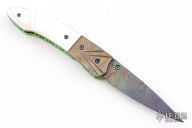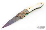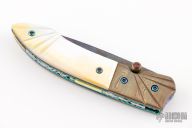 This linerlock by Appaloosa Knives features a Damascus blade with a single brass thumbstud with red stone inlay. The handle has fluted Damascus bolsters, carved gold lip pearl scales, fileworked and anodized titanium liners and a fileworked stainless steel backspacer with gold lip pearl inlays. Nice detent and lockup. Comes with a leather magnetic case. Excellent condition.