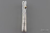 This linerlock by Appaloosa Knives features a mirror polished blade with fileworked blade spine and a single brass thumbstud with abalone inlay. The handle has polished and fluted stainless steel bolsters, mother of pearl inlays, fileworked stainless steel liners and backspacer with gold lip pearl inlays. Nice detent, lockup and blade seating. Comes with a leather magnetic case. Has a few light scratches, otherwise excellent condition.