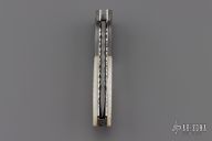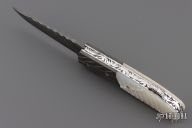 This Lockback by Appaloosa Knives features a Damascus blade with a fileworked spine. The handle has fluted Damascus bolsters, carved mother of pearl scales, fileworked stainless steel liners and backspacer. Nice blade seating and lockup. Comes with a leather magnetic case. Excellent condition.