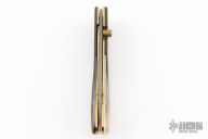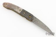 This linerlock by Appaloosa Knives features a Damascus blade with a single brass thumbstud with black lip pearl inlay. The handle has Damascus bolsters, carved black lip pearl scales, anodized titanium liners and a fileworked stainless steel backspacer with black lip pearl inlays. Nice detent, blade seating and lockup. Comes with a leather magnetic case. Excellent condition.