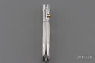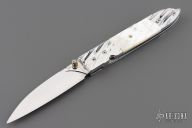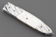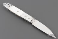 This linerlock by Appaloosa Knives features a mirror finished blade with fileworked spine and a single brass thumbstud with abalone inlay. The handle has polished and carved stainless steel bolsters, carved mother of pearl scales, fileworked stainless steel liners and backspacer. Nice detent, lockup and blade seating. Comes with a leather magnetic case. Has a few light scratches, otherwise excellent condition.