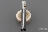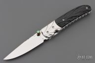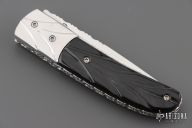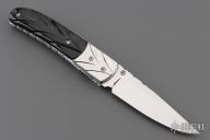 This linerlock by Appaloosa Knives features a mirror finished blade with fileworked spine and a single brass thumbstud with abalone inlay. The handle has polished and carved stainless steel bolsters, carved buffalo horn scales, fileworked stainless steel liners and backspacer. Nice detent, lockup and blade seating. Comes with a leather magnetic case. Has a few light scratches, otherwise excellent condition.