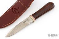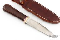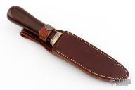 This Gambler by Randall Made Knives features a satin finished blade with .209" blade stock and 1.059" blade depth, hidden tang construction. Sharpened top edge. Notched thumbrest. Walnut wood grip with brass guard and red/white/blue spacers. The Gambler is one of Randall's non-catalog knives. Comes with a waxed brown leather sheath. Has a couple light scratches and patina, otherwise excellent condition.