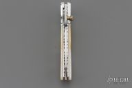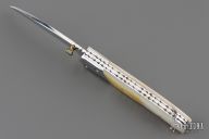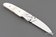 This linerlock by Appaloosa Knives features a mirror finished blade with fileworked spine and a single brass thumbstud with abalone inlay. The handle has polished and carved stainless steel bolsters, carved mother of pearl scales, fileworked stainless steel liners and backspacer. Nice detent, lockup and blade seating. Comes with a leather magnetic case. Has a few light scratches, otherwise excellent condition.