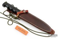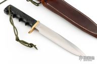 This Model 16 Diver from Randall Made Knives has a satin finished stainless steel spear point blade with sharpened top edge and notched thumbrest, .229" blade stock and 1.23" blade depth, full tang construction. Handle has a brass guard, black linen micarta single finger grip handle. Comes with waxed brown leather sheath and stone. Has some patina and some light scratches, excellent condition otherwise.