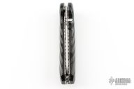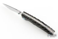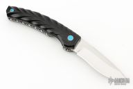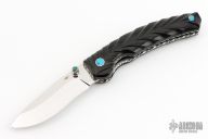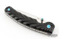 This linerlock by Appaloosa Knives features a mirror finished blade with fileworked spine and a single thumbstud with abalone inlay. The handle has carved African Blackwood scales, turquoise/steel pins, fileworked stainless steel liners and backspacer. Nice detent, lockup and blade seating. Excellent condition.