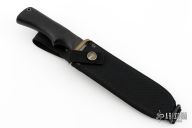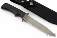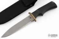 This AWAC by Blackjack Knives features a bead blasted drop point blade, .175" blade stock and 1.074" blade depth, hidden tang construction. The handle has a bead blasted brass guard and a black paper micarta grip with lanyard hole. Comes with a black nylon sheath and original box. Has some scuffs and patina, great condition otherwise.