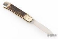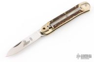 This Lever Lock Automatic by Hubertus Knives features a polished drop point blade. The handle is comprised of nickel silver bolsters and lever with stag scales over brass liners and steel backspacer. Has some light scratches, otherwise excellent condition.