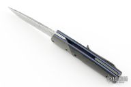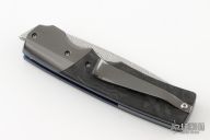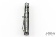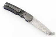This Mini Hunter Front Flipper by Jason Clark features a Damasteel blade with a notched front flipper. The handle has dovetailed zirconium bolsters, marble carbon fiber scales, anodized and orange peel finished titanium liners, a floating zirconium backspacer, and tip up clip. Rides on IKBS, nice detent, lockup and blade seating. Comes with Velcro pouch. Excellent condition.