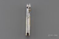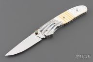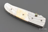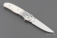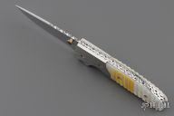 This linerlock by Appaloosa Knives features a mirror finished blade with fileworked spine and a single brass thumbstud with abalone inlay. The handle has polished and carved stainless steel bolsters, carved gold lip and mother of pearl scales, fileworked stainless steel liners and backspacer. Nice detent and lockup. Has a few light scratches, otherwise excellent condition.