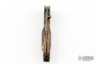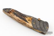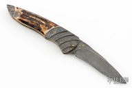 This knife by KJ Custom Knives (Suchat Jangtanong's Son) features a Damascus blade with false top edge and single thumbstud with stag inlay. The handle has carved Damascus bolsters, stag scales, anodized and fileworked titanium liners and backspacer. Excellent condition.