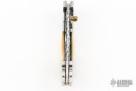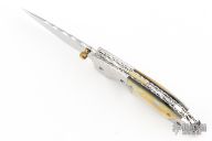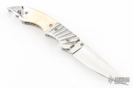 This linerlock by Appaloosa Knives features a mirror finished blade with fileworked spine and a single brass thumbstud with gold lip pearl inlay. The handle has polished and carved stainless steel bolsters, gold lip pearl scales, fileworked stainless steel liners and backspacer with gold lip pearl inlays. Nice detent, lockup and blade seating. Has a few light scratches, otherwise excellent condition.