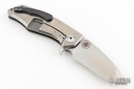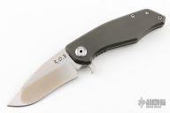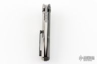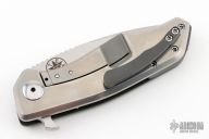 This Gladius by Robert Oldaker features a satin finish tanto blade with notched thumbrest and flipper. The handle has a Zirconium front scale, backspacer and tip up clip, satin finished titanium lockside. Nice detent, lockup and blade seating. Comes with a zipper case and maker's card. Has some light scratches, excellent condition otherwise.