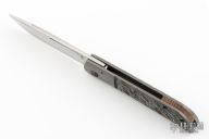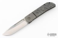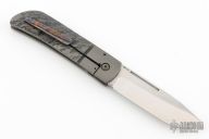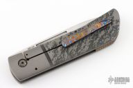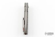 This Sodbuster Front Flipper by Jonathan McNees features a drop point satin finished blade with notched thumbrest and front flipper. The handle has a laser engraved bead blast finished titanium frame, laser engraved titanium pivot, and tip up mokuti clip, natural linen micarta backspacer. Nice detent, lock up and blade seating, rides on bearings. Comes with a cloth pouch and COA dated 2019. Excellent condition.