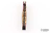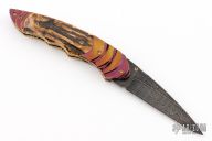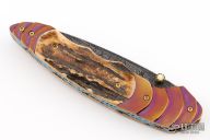 This knife by KJ Custom Knives (Suchat Jangtanong's Son) features a Damascus blade with fileworked spine and single brass thumbstud with gold lip pearl inlay. The handle has carved and anodized titanium bolsters, stag scales, gold plated screws, anodized and fileworked titanium liners and backspacer. Nice detent, lockup and blade seating. Excellent condition.