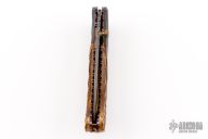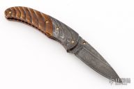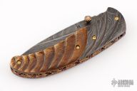 This knife by KJ Custom Knives (Suchat Jangtanong's Son) features a Damascus blade with fileworked spine and single brass thumbstud with bone inlay. The handle has carved Damascus bolsters, carved and dyed bone scales, gold plated screws, anodized and fileworked titanium liners and backspacer. Nice detent, lockup and blade seating. Excellent condition.
