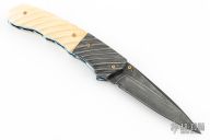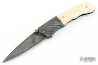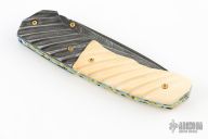 This knife by KJ Custom Knives (Suchat Jangtanong's Son) features a Damascus blade with fileworked spine and single brass thumbstud with black lip pearl inlay. The handle has fluted Damascus bolsters, fluted bone scales, gold plated screws, anodized and fileworked titanium liners and backspacer. Nice detent and lockup. Excellent condition.