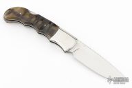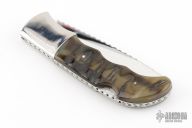 This Lockback by Appaloosa Knives features a mirror polished blade with a fileworked spine and nail nick. The handle has mirror polished stainless steel bolsters, sheeps horn scales, stainless steel liners and fileworked backspacer. Nice blade seating and lockup. Excellent condition.