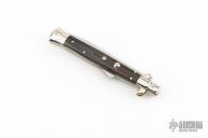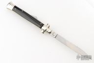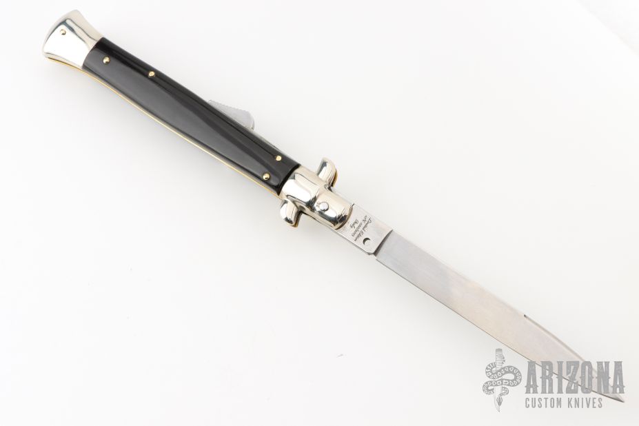 This Humpback Stiletto by Frank Beltrame features a tumble polished and tumbled bayonet ground blade. Coil spring auto. The handle has nickel silver bolsters, buffalo horn scales, brass liners and pins, stainless steel backspacer. Has safety. Excellent condition. "Limited Edition #020/2013" on blade.