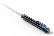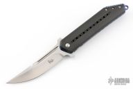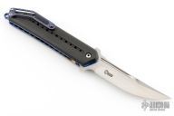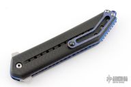 This Custom Kwaiken by Todd Begg features a hand rub satin finished blade with fullers and flipper. The handle has carbon fiber scales, anodized and cracked ice finished titanium liners, notched backspacer with lanyard hole and tip up clip. Rides on bearings, nice detent, lockup and blade seating. Comes with a zippered case. Excellent condition.