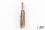 This Gent's Linerlock folder features a Damascus blade with false top edge. The handle has stainless steel bolsters, jigged bone scales, anodized titanium liners, fileworked stainless steel backspacer. Has scratches, has been used and carried, fair condition.