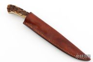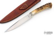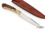 This knife by Mike Rochford features a hand rub satin finished blade with notched thumbrest and a false top edge, .187" blade stock and .929" blade depth, full tapered tang construction. The handle has engraved stainless steel bolsters with 24k gold inlays, stag scales, lanyard hole at the butt. Comes with a brown leather sheath. Has a couple light scratches, otherwise excellent condition.