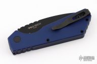 This Pro-Strider PT by Pro-Tech and Strider Knives features a black blade with notched thumbrest. The handle has a solid midnight blue aluminum frame with black hardware and black stainless steel tip up clip.  Abalone inlaid into the push button. Comes with original box, pouch, and papers.  Limited Edition.  Excellent Condition.