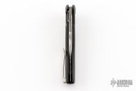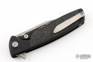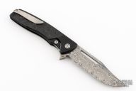 This Evo Typhoon from Brian Nadeau features a Damasteel blade with a fuller and thumbrest. The handle is comprised of a black tumbled titanium frame with marble carbon fiber inlays, satin titanium tip up clip. Rides on bearings, nice detent, lockup and blade seating, stainless lockface insert. Excellent condition. Comes with original box.